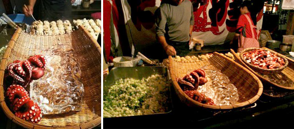De volta a Tokyo, demos sorte ao encontrar um festival de rua com barraquinhas de guloseimas. Esbanjei todo o meu japonês pedindo “Ikko, kudasai” na barraca de Takoyaki (croquetes de polvo), porém me perdi quando a atendente perguntou não-sei-o-quê. Mas aí ela sacudiu um saquinho plástico significantemente e eu afirmei que sim, que queria embalado pra viagem (do meu jeito, né).