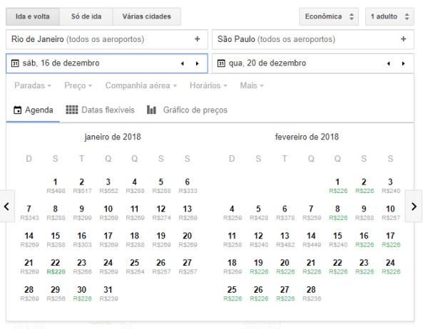Eu gosto da facilidade com que você consegue ver os preços nas diferentes datas (na imagem abaixo, as mais baratas ficam em verde), mesmo que na maioria dos sites você também consiga fazer essa comparação, aqui eu acho que a interface funciona melhor. Além disso tem diversas opções de filtro e pesquisa.