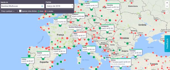 Hoje em dia quase todos fazem isso, mas o Skyscanner tem uma função bem legal onde você escolhe seu destino por um mapa interativo de valores. É bem legal quando você quer visitar lugares próximos mas não sabe muito bem pra onde ir, com esse mapa você consegue visualizar os melhores custo-benefício.