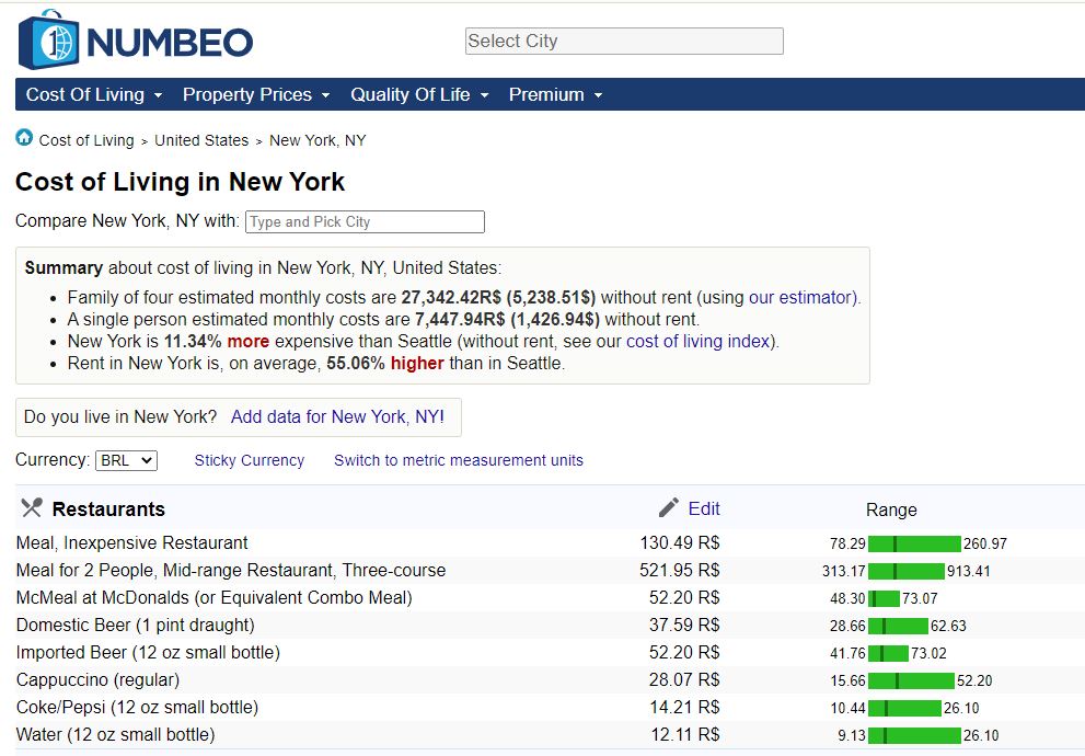 Esse site (disponível apenas em ingles) possui um data base bem completo do custo de vida de várias cidades do mundo inteiro. Selecione “BRL” em “Currency” para ver os valores em Real Brasileiro.